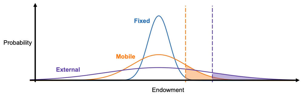 A simple financial economic model can be used to illustrate this point. We can extract talent mobility by considering the endowment distributions of fixed, mobile and external talent. Even if we assume that all three groups share the same mean endowment, each group has a different variance.